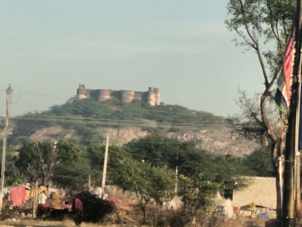 आगे खूड कस्बा, फिर दांता Danta और एक अजीब नाम वाले गाँव ‘बाए’ से गुजरते हुए हम खाटू श्याम Khatu Shiyam की ओर बढ़ते गए। खाटू श्याम Khatu Shiyam के पास खेती की सघनता काफी बढ़ गई थी। अधिकतर गेहूँ और जौ की खेती थी, जो पूरी तरह स्प्रिंकलर सिस्टम पर निर्भर थी। रास्ते में एक ऊँची पहाड़ी पर एक पुराना किला भी दिखाई देता है, लेकिन उसके इतिहास के बारे में बताने वाला कोई नहीं था। कभी उसे देखने का अवसर अवश्य मिलेगा।